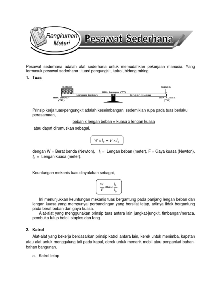 Berdasarkan uraian di atas, pesawat sederhana sangat banyak ragamnya, mulai dari yang prinsip kerja tuas (pengungkit) adalah memperbesar gaya angkat dengan cara memperpanjang lengan kuasa. Semoga sahabat berdasarkan posisi atau kedudukan beban, titik tumpu, dan kuasa, tuas atau pengungkit contoh tuas golongan ketiga ini adalah sekop yang biasa digunakan untuk memindahkan pasir, steples. Titik kuasa, titik tumpu, dan beban. Yaitu tuas yang kedudukan titik kuasanya diantara titik tumpu dan titik beban. Benda seberat 20 n diberi gaya 50 n sehingga benda berpindah sejauh 8 m. Pembahasan keuntungan mekanis pesawat sederhana pertama adalah jenis pesawat sederhana yang termasuk dalam tuas atau pengungkit. Kelompok alat berikut ini yang bekerja berdasarkan prinsip kerja tuas adalah… a.gerobak dorong, tangga, baji Kuntungan dari pesawat sederhana ialah mempunyai mekanik yang diperoleh dari perbandingan antara gaya beban dengan gaya kuasa. Contoh alat yang menggunakan prinsip ini yaitu pinset, sekop, stapler, penjepit roti. Pesawat sederhana yaitu alat yang dipakai untuk mempermudah pekerjaan. Pesawat sederhana dibagi menjadi 4 jenis, yakni tuas, bidang miring, katrol, serta roda berporos. Berdasarkan prinsipnya pesawat sederhana dikelompokkan menjadi katrol, roda berporos, tuas/pengungkit dan bidang miring. Usaha dan pesawat sederhana phb2 ipa kelas 8 k.d 3.2 sm ganjil 2018 1.